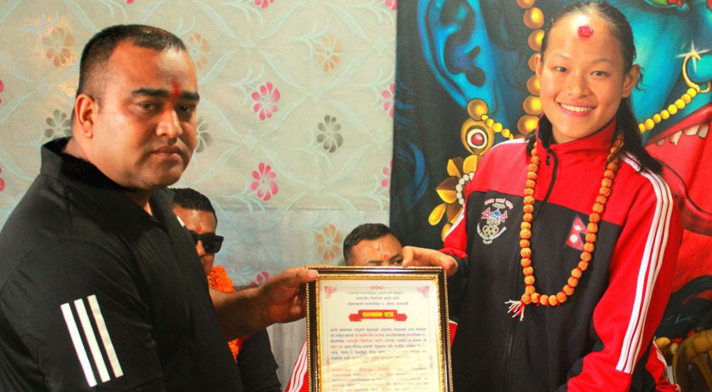 विजयीदशमीको अवसरमा आयोजित शुभकामना आदान प्रदान कार्यक्रममा खेलाडी सम्मानित भएका हुन् । सम्मानित हुनेमा एरिका गुरुङसहित सन्तोष श्रेष्ठ, सविना श्रेष्ठ, वर्षा बुढा मगर, स्वनिम मानन्धर, सानुमाया थिङ, मनीष कार्की, सन्जु देशार, निरुपमा डोङ तामाङ, अन्जली महर्जन, एलोन श्रेष्ठ, मिनबहादुर तामाङ, मोहम्मद शेखु आलम, तेन्जिङ शेर्पा प्रदीप बैजाली मगर, लिजन साउद र एलिशा रास्कोटी मगर हुनुहुन्छ ।